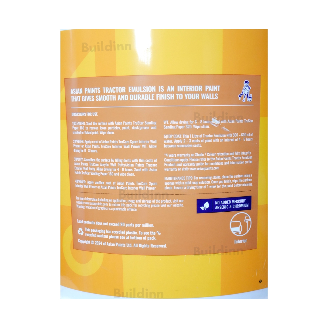 Asian Paints Tractor Emulsion is an affordable yet high-quality interior wall paint designed to provide a smooth and long-lasting finish. It offers better coverage and durability than distempers, making it a cost-effective choice. With its rich matte finish and excellent colour retention, it enhances the aesthetic appeal of any space. The paint’s superior washability allows easy maintenance, ensuring clean and fresh walls for years. It is the perfect choice for homes looking for affordable elegance.